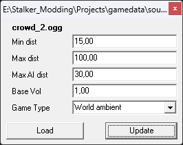 | Game Type | Determines how the sound will be perceived by NPCs and mutants in the game | undefined. anomaly_idle. item_dropping. item_hiding. item_pickup. item_taking. item_using. NPC_attacking. NPC_dying. NPC_eating. NPC_injuring. NPC_step. NPC_talking. object_breaking. object_colliding object_exploding. weapon_bullet_hit. weapon_empty_click. weapon_recharging. weapon_shooting. world_ambient |