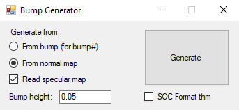 - Generates *_bump.dds and *_bump#.dds textures from normal maps (with the ability to use specular maps)